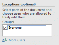 Step 5. Still under the Restrict Editing task pane, go to the Exceptions (optional) section and click Everyone or More users to choose the group allowed to edit the locked parts of your Microsoft Word document.